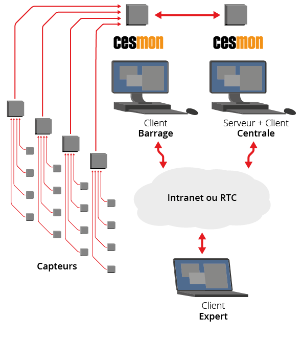 CESMON centralise les données de plusieurs ouvrages en même temps. Chacun est équipé d’un concentrateur qui transmet les données au serveur via le réseau.